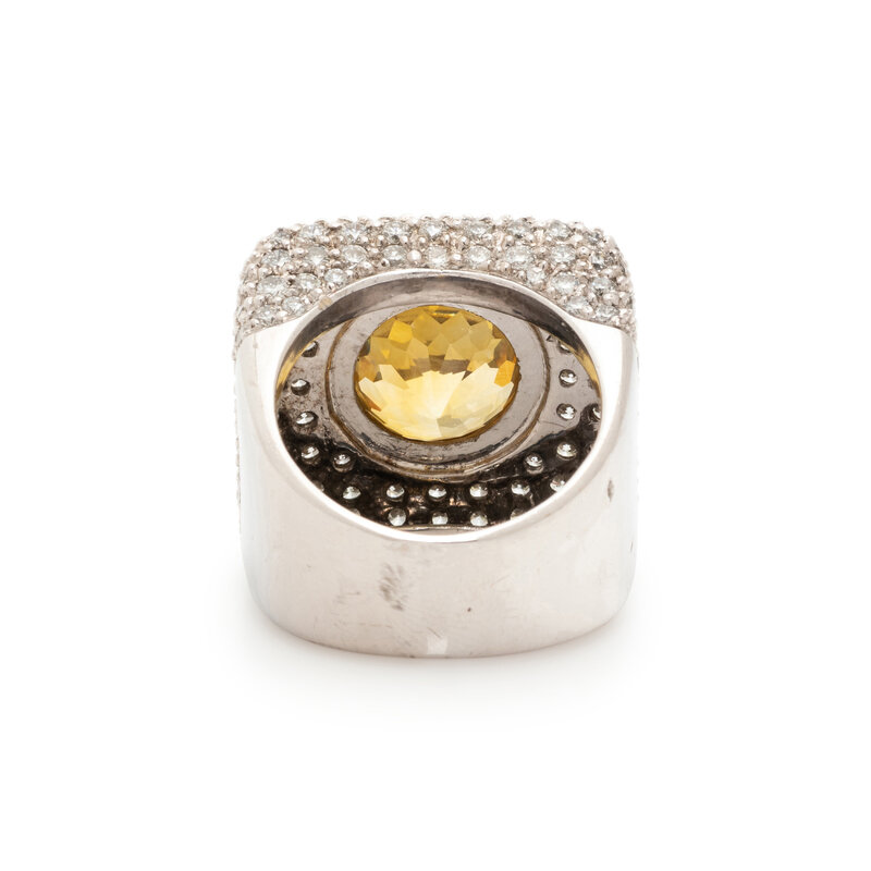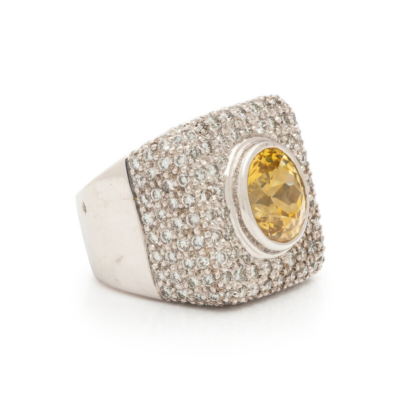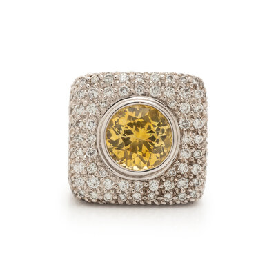 Round sapphire weighing approximately 7.50 carats by formula, and round diamonds weighing approximately 4.00 carats total. 18 karat white gold. Ring size 7.
