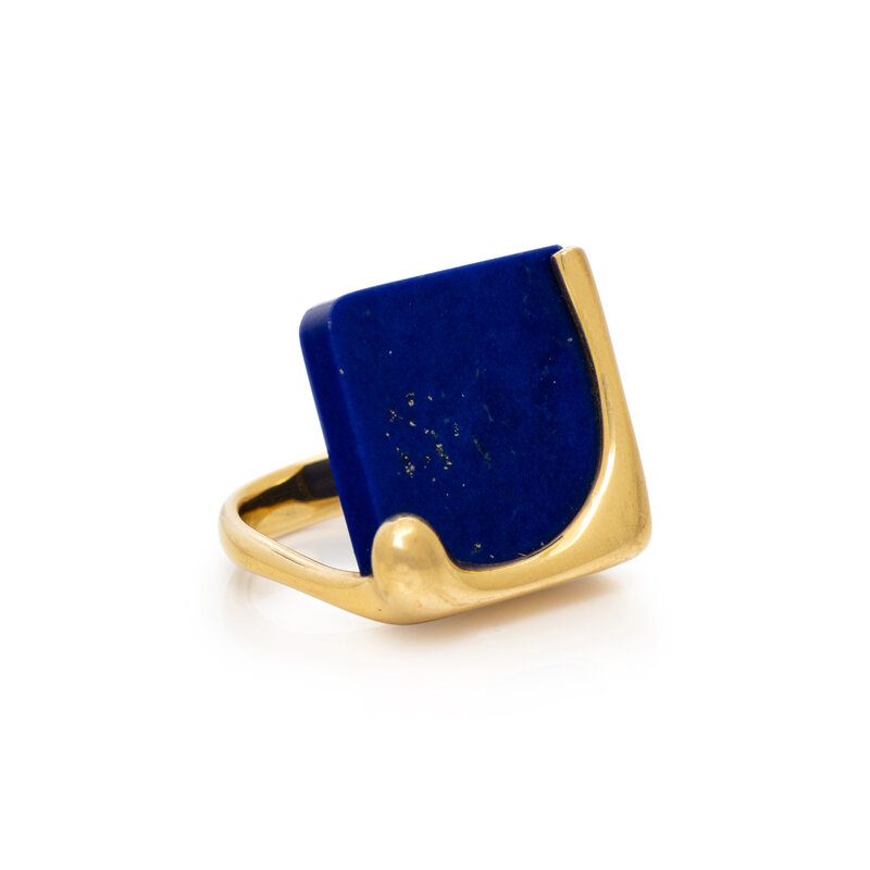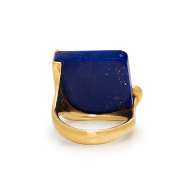 Lapis lazuli measuring approximately 15.90 x 15.90 mm. 18 karat yellow gold. Ring size 5 1/2.