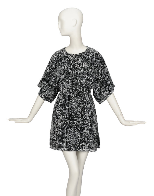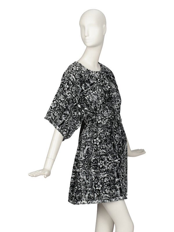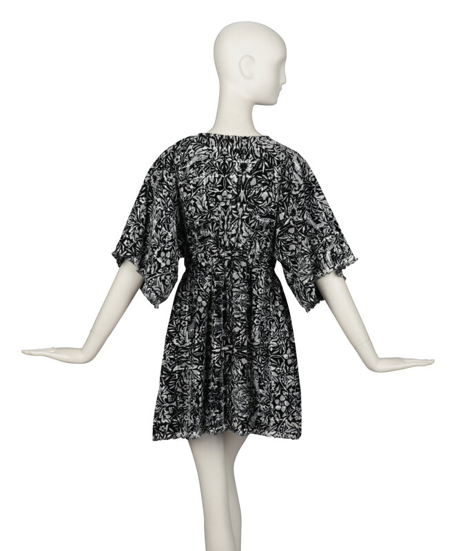 Minidress in cut cotton velvet terrycloth with an all-over black & white floral print. Round, collarless neckline. Elbow-length incorporated kimono sleeves. Three-quarter zipper closure at front neckline. Elasticated waist. Frayed raw edges at sleeve and skirt hems. Two in-seam pockets in skirt. Unlined.