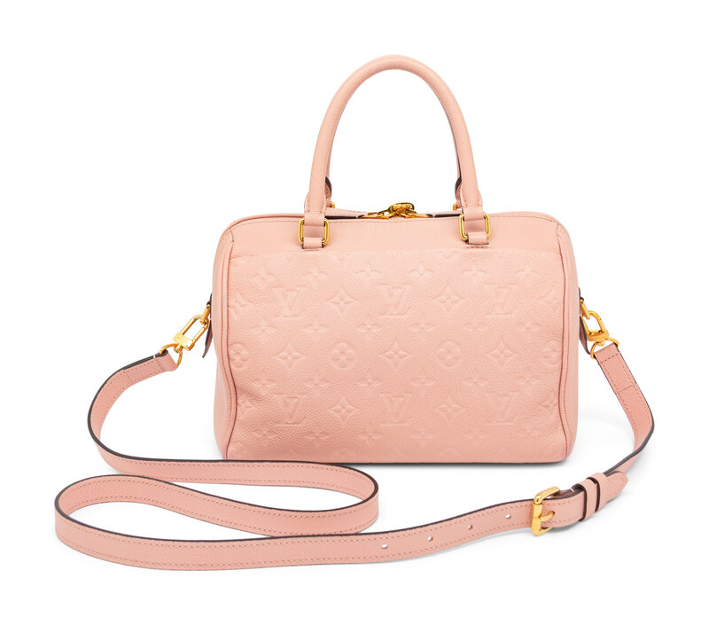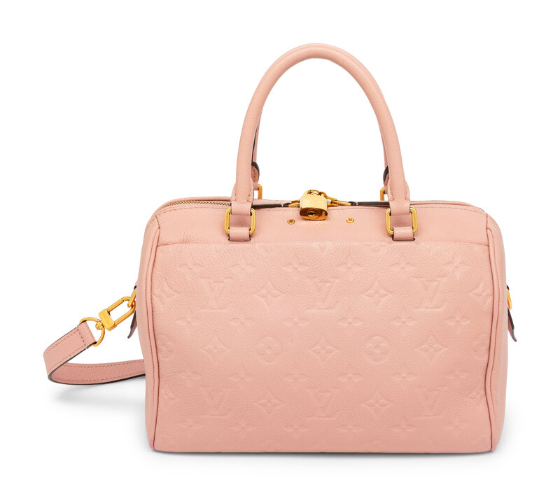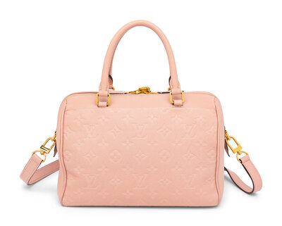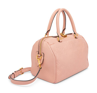 Speedy Bandouliere 25 NM Bag in rose poudre monogram empreinte grained leather with gold-tone hardware. Double zipper closure; top handles and removable shoulder strap.