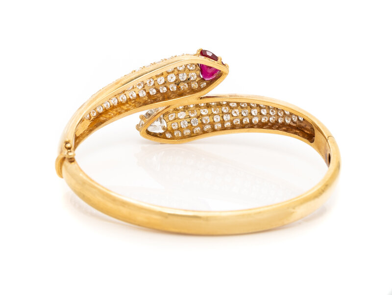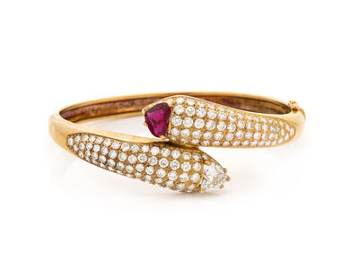 Heart shaped ruby weighing approximately 1.00 carat by formula, heart shaped diamond weighing approximately 1.15 carats, and round diamonds weighing approximately 3.45 carats total, hinged with side clasp. 18 karat yellow gold. 6 1/2 inches inner circumference.