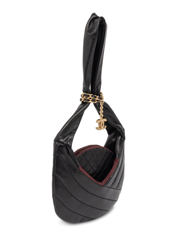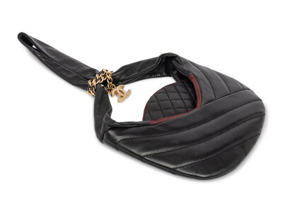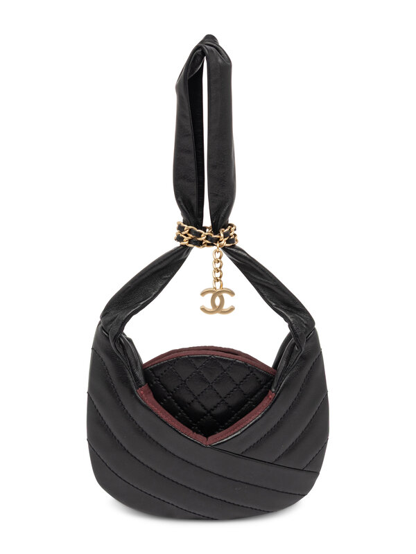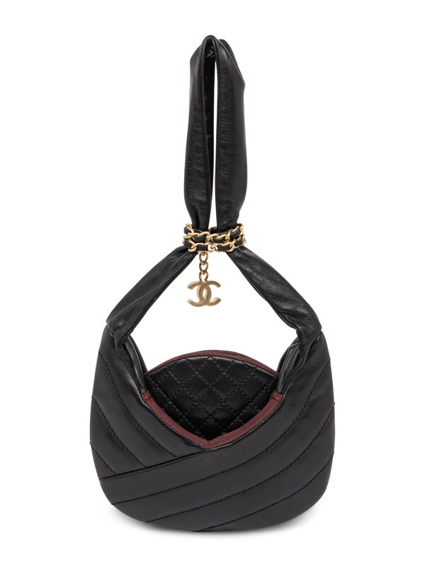 Chanel chaplain evening bag in quilted black leather with matte gold-tone hardware. Magnetic snap closure and leather handle with interwoven leather-metal chain & dangling CC charm details.