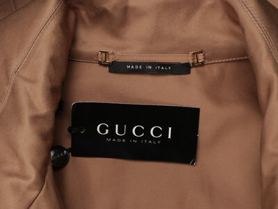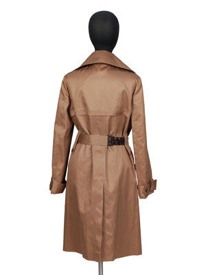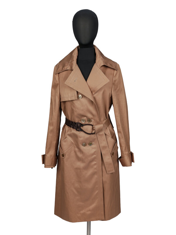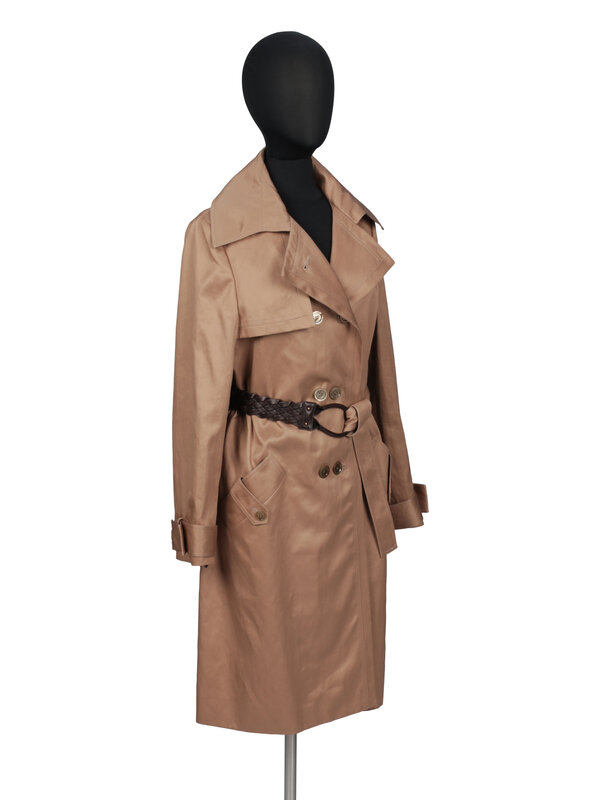 Trench coat in tan cotton twill. Large spread collar with notched lapels/convertible collar. Knee-length. Full length sleeves with buttoned belts at both cuffs. Two welt pockets at front with buttoned tab closures. Removable belt in dark brown woven leather and cotton twill. Double breasted button closure at front. Unlined.