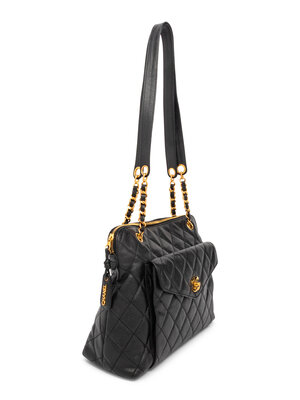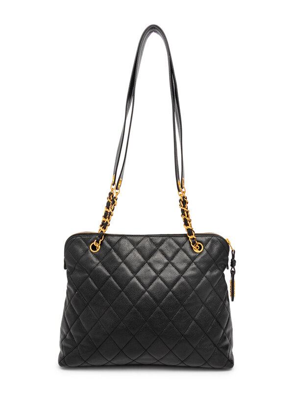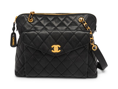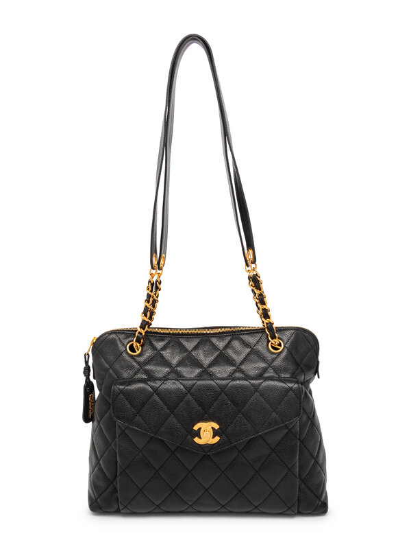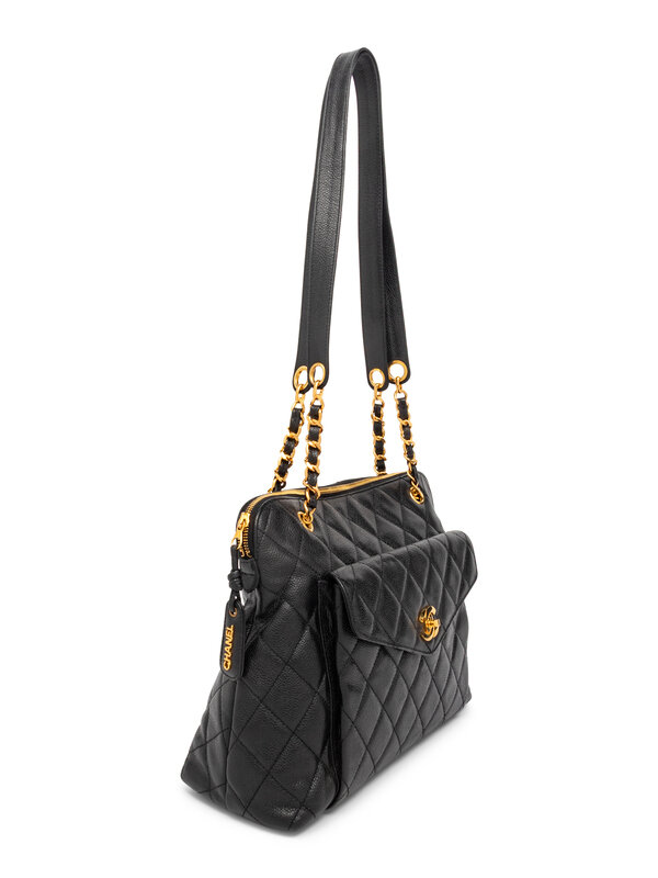 Chanel front pocket shoulder bag in quilted black caviar leather with 24k-gold plated hardware. Zippered top closure; interwoven leather-metal chain and leather straps.