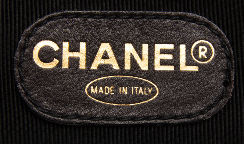 Additional Details: Exterior slip pocket at front with turn-lock closure; leather zipper pull with "CHANEL" hardware, two interior zipper pockets