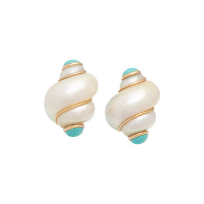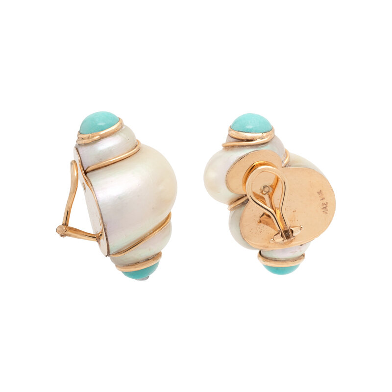 Shell and round cabochon turquoise measuring approximately 8.00 mm. 14 karat yellow gold. 1 1/4 inches long.