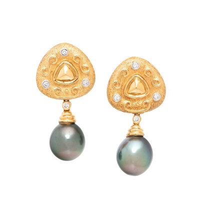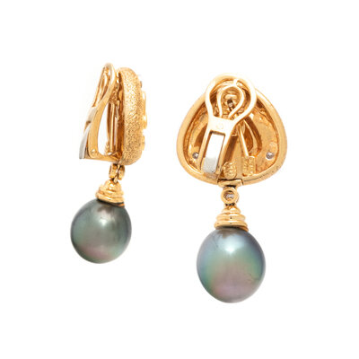 Gray cultured pearls (origin of color not tested) measuring approximately 13.85 x 12.70 mm and round diamonds, with retractable posts. 18 karat yellow gold. 1 5/8 inches long.