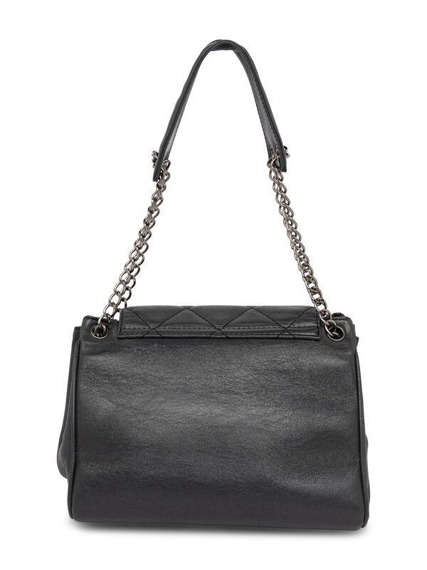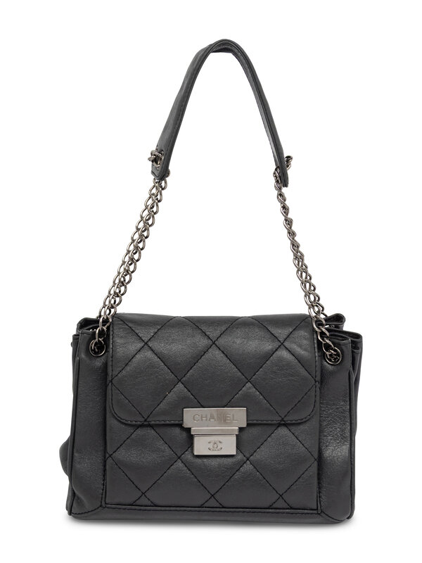 Chanel accordion push-lock flap bag in grey glazed leather with quilting details and silver-tone hardware. Push-lock closure to flap and metal chain and leather strap.