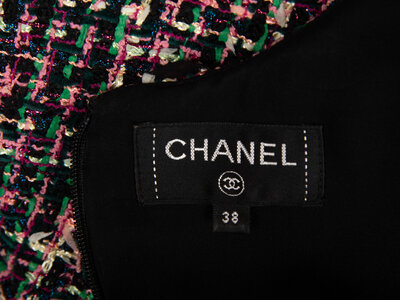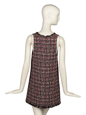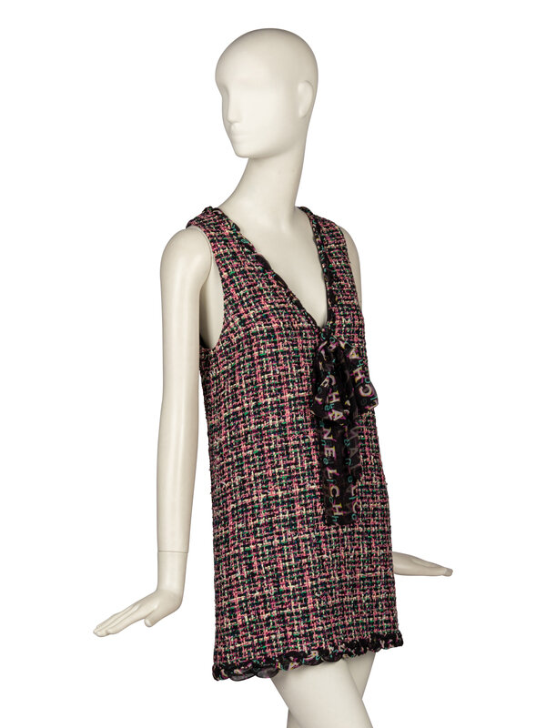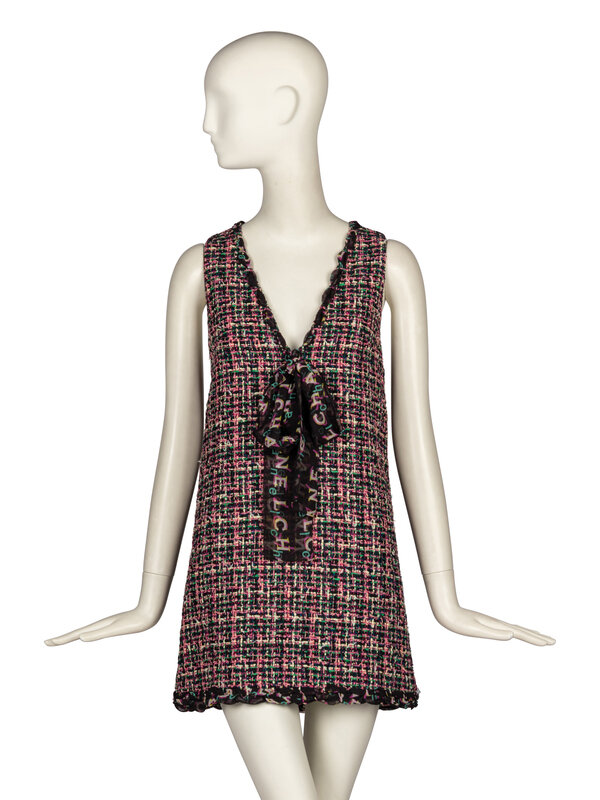 Mini shift dress in multicolor fantasy tweed. Printed silk organza bow at front & trim throughout. Deep V neckline. Invisible zipper closure at back. Fully lined in black silk jacquard.