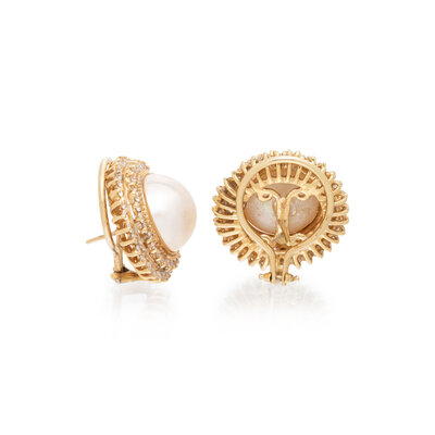 Mabé pearls measuring approximately 14.00 mm wide and round diamonds weighing approximately 3.00 carats total. 18 karat yellow gold. 1 inch long.