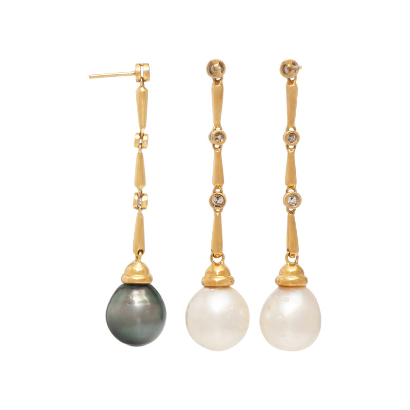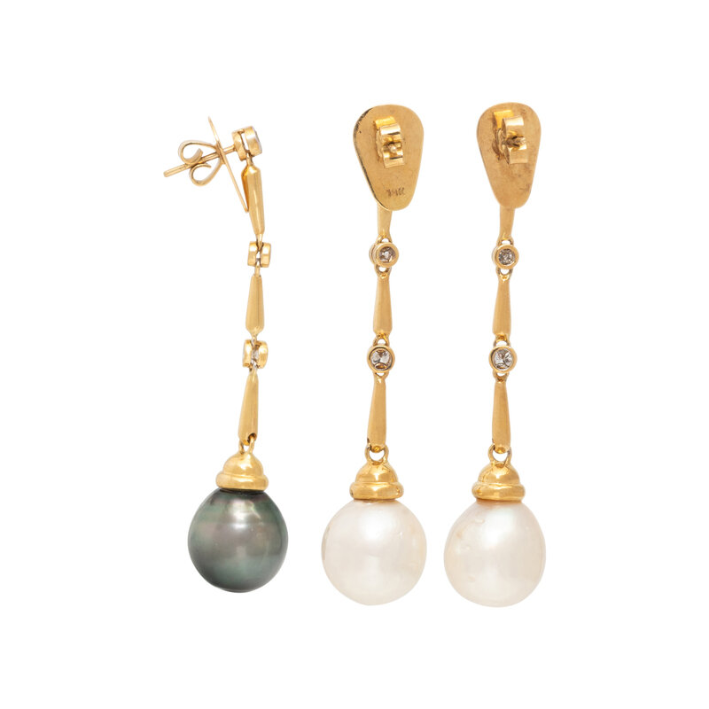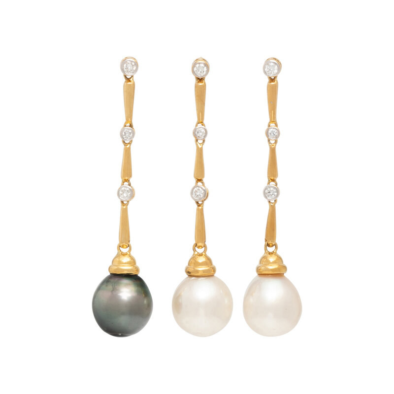 A set of three earrings to be worn in matching or mismatched style, with two white cultured pearl drops measuring approximately 13.75 - 14.00 mm, one gray cultured pearl drop (origin of color not tested) measuring approximately 14.00 mm, and round diamonds weighing approximately 0.70 carat total. 18 karat yellow gold. 2 1/2 inches long.