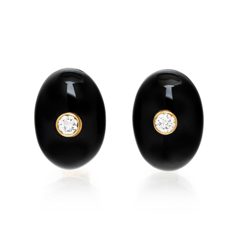 Black enamel and round diamonds weighing approximately 0.35 carats total. 18 karat yellow gold. 3/4 inch long.