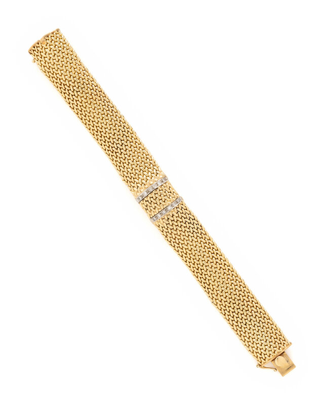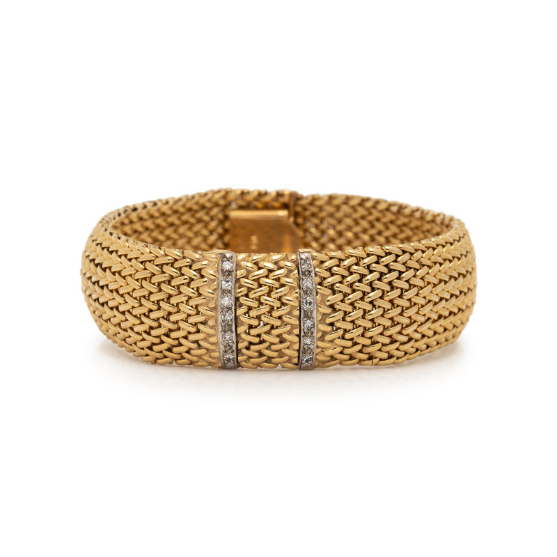 Single cut diamonds. 14 karat yellow and white gold. 7 3/16 inches long, 11/16 inch wide.