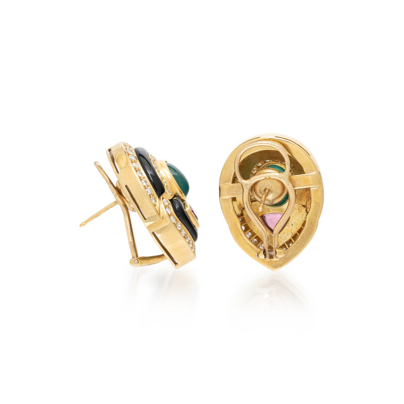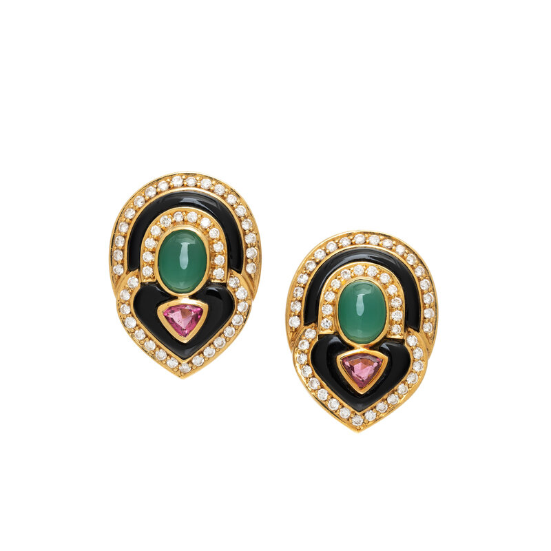 Oval cabochon chrysoprase, triangular pink tourmaline, black onyx, and round diamonds weighing approximately 1.25 carats total. 18 karat yellow gold. 1 1/16 inches long.