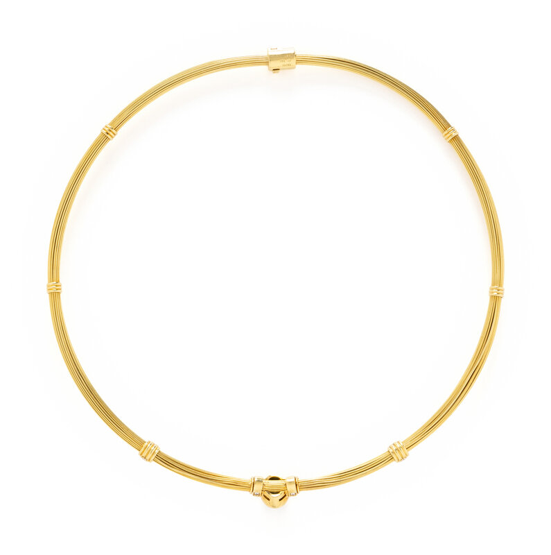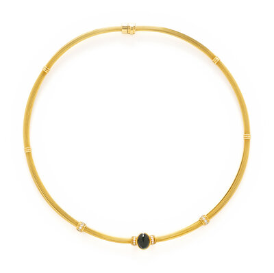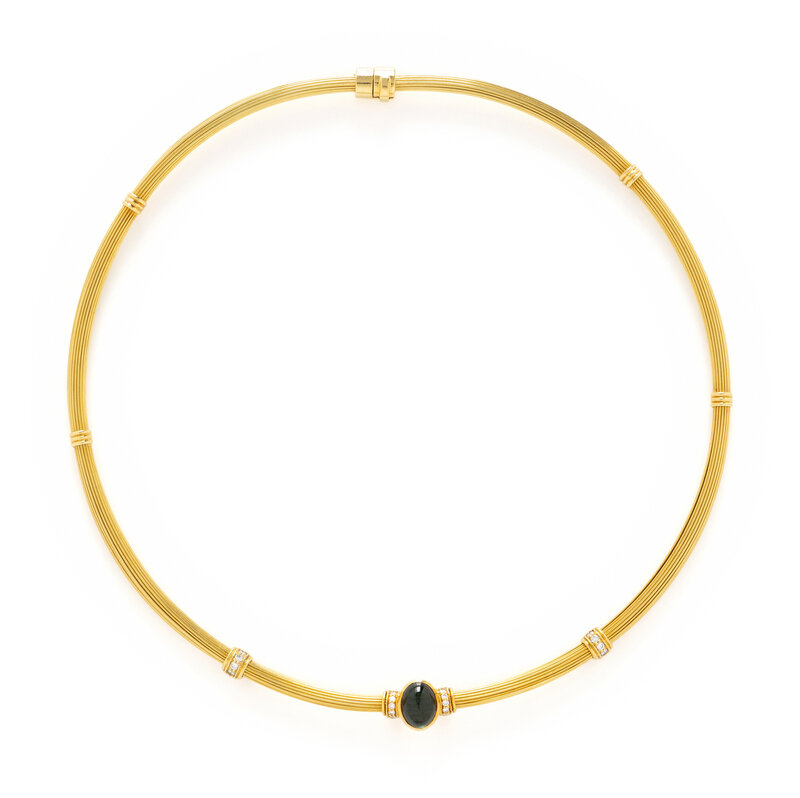 Oval cabochon green tourmaline measuring approximately 8.70 x 6.80 mm and round diamonds.18 karat yellow gold. 15 inches inner circumference.