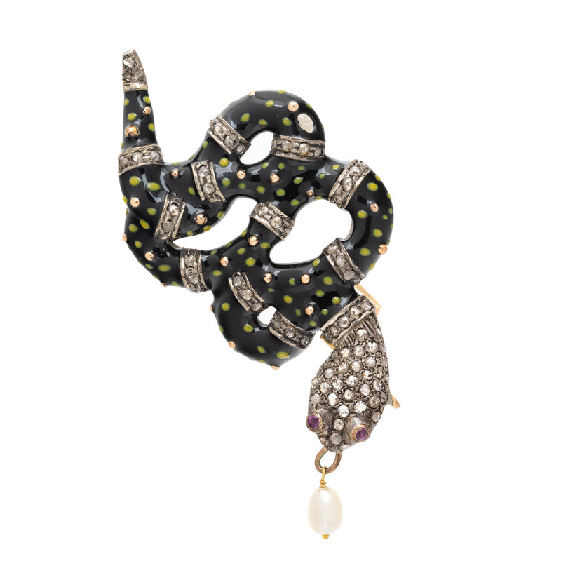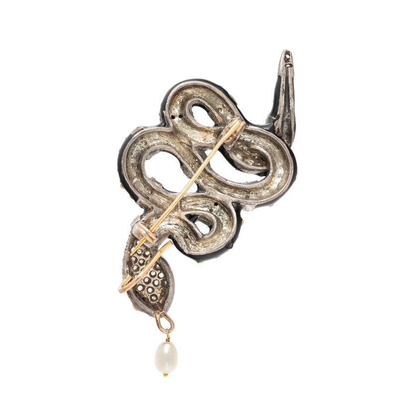 CULTURED PEARL, ENAMEL, AND DIAMOND SNAKE BROOCH PENDANT