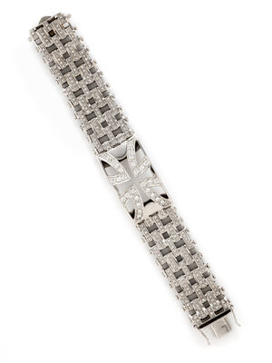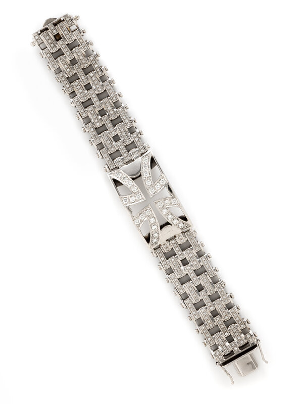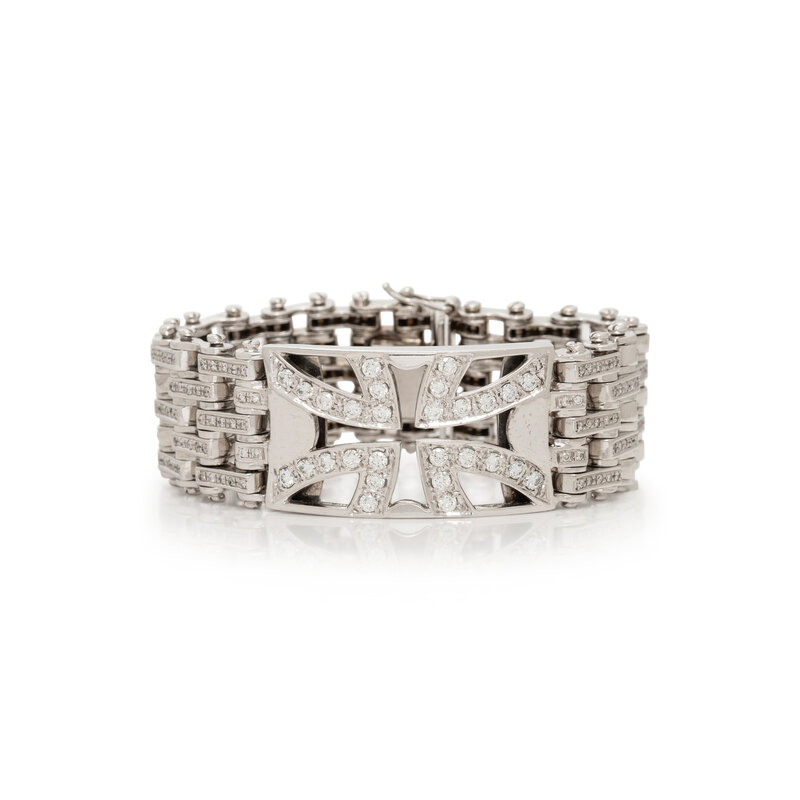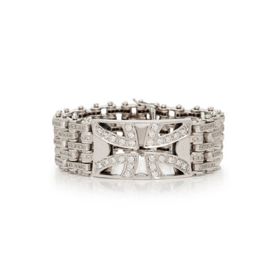 Round diamonds weighing approximately 5.50 carats total. 14 karat white gold. 7 inches long, 7/8 inch wide.