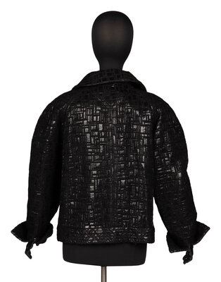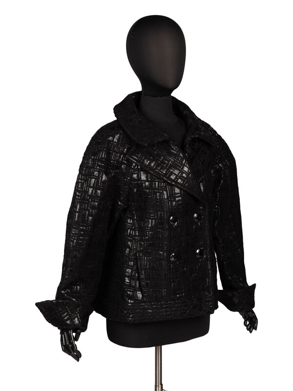 Boxy peacoat jacket in black lamé & bouclé fantasy tweed. Peaked notched lapels and large spread collar. Full-length rounded raglan sleeves with optional turned-up cuffs. Two in-seam pockets at front. Double-breasted button closures at front with black 'planet' buttons. Metal chain at interior hem. Fully lined in black silk jacquard.