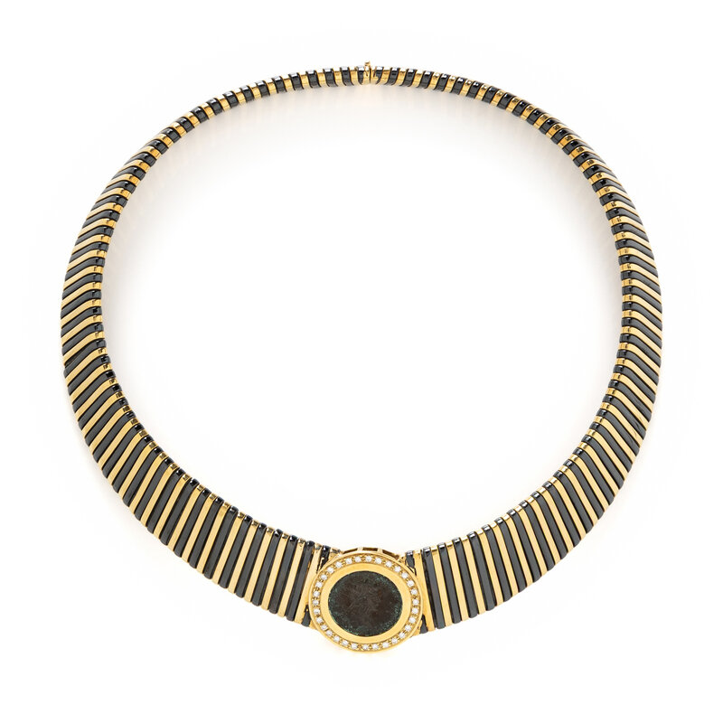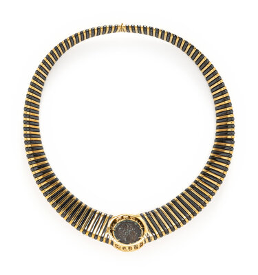 Coin measuring approximately 16.15 mm, and round diamonds. 18 karat yellow and blackened gold. 15 3/4 inches long.