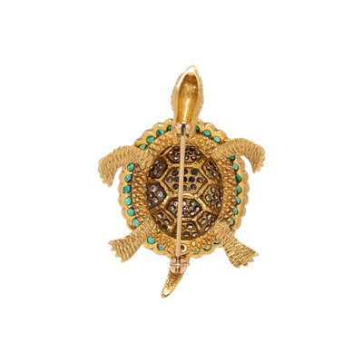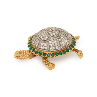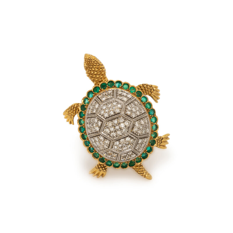 Single cut diamonds weighing approximately 1.25 carats total and round emeralds. White and yellow gold. 1 3/4 x 1 1/4 inches.
