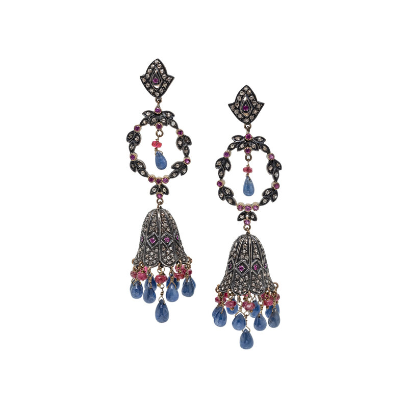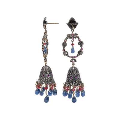 RUBY, SAPPHIRE, AND DIAMOND PENDANT EARRINGS