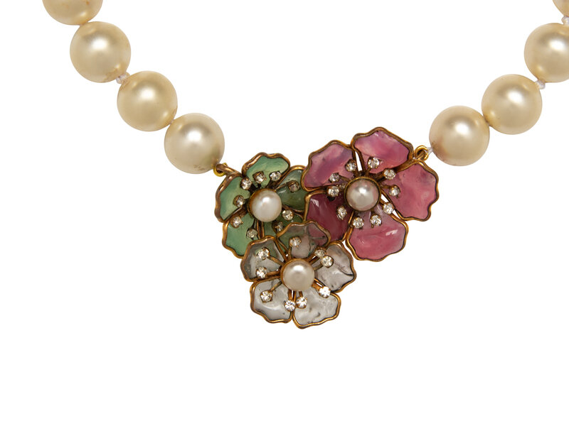 Choker necklace in faux-pearl beads with a Maison Gripoix pâte de verre & rhinestone multi-flower camellia pendant. Hook and loop closure. Stamped 'CHANEL' at back of pendant.