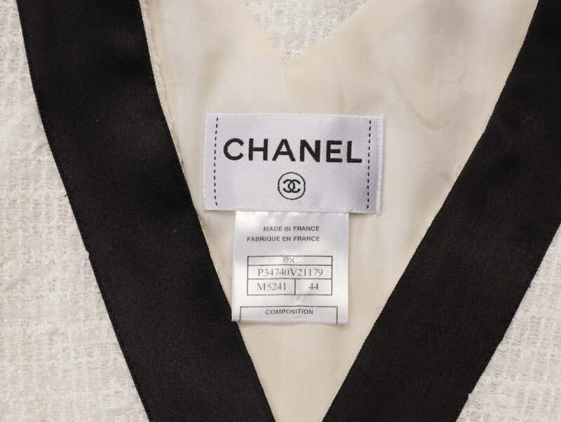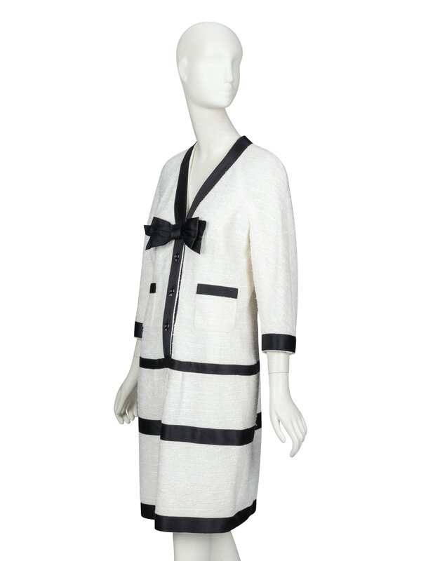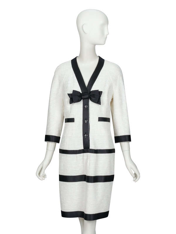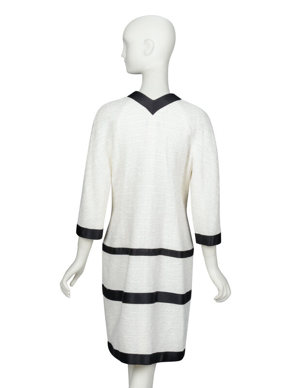 Day dress in white nylon/cotton/wool-blend bouclé tweed with black satin ribbon appliqué trim throughout. V-neckline. Three-quarter length raglan sleeves. Two patch pockets at front. Metal heart-shaped CC button and snap closures at front. Decorative bow at base of neckline. Fully lined in tonal silk jacquard.