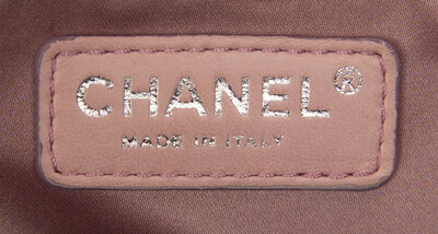 Additional Details: Light pink satin lining, interior zipper pocket, two interior sidewall slip pockets, zippered pocket in leather shoulder strap with dangling CC zipper pull charm.