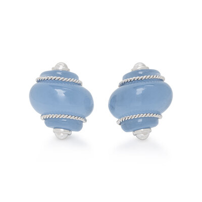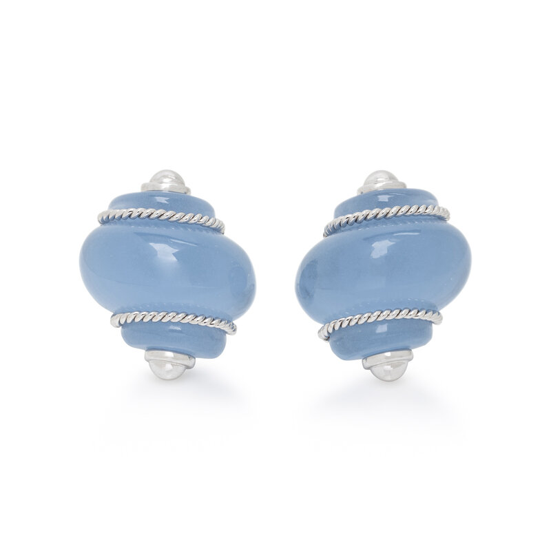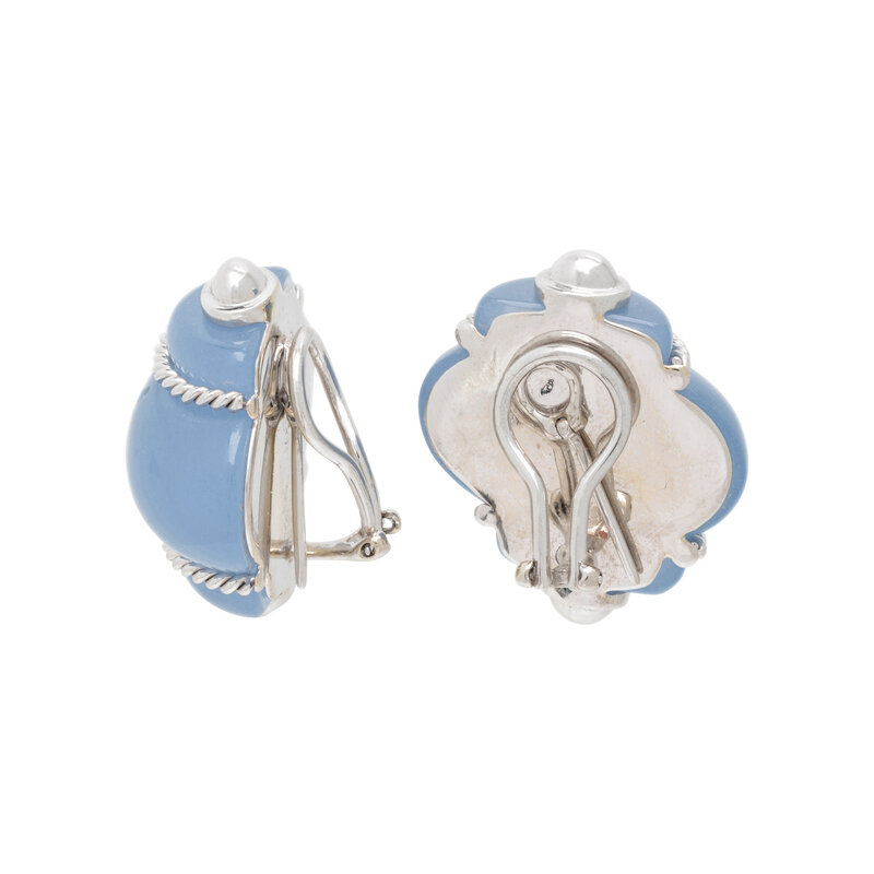 Carved blue resin shells. 18 karat white gold. 1 inch long.
