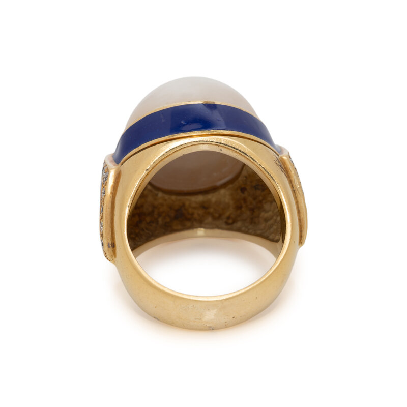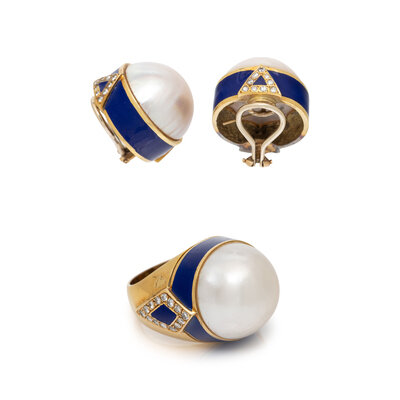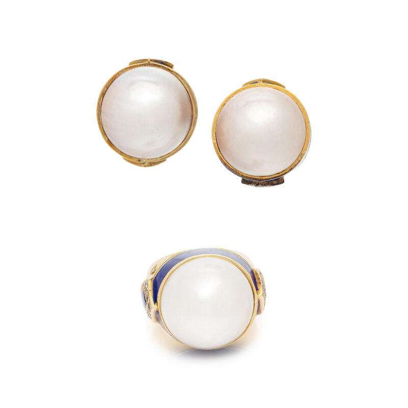 Including a ring set with a mabé pearl measuring approximately 18.40 mm, blue enamel, and round diamonds, and a matching pair of earrings with mabé pearls measuring approximately 17.75 mm, blue enamel, and round diamonds. 18 karat yellow gold. Ring size 8. Earrings: 7/8 inch long.
