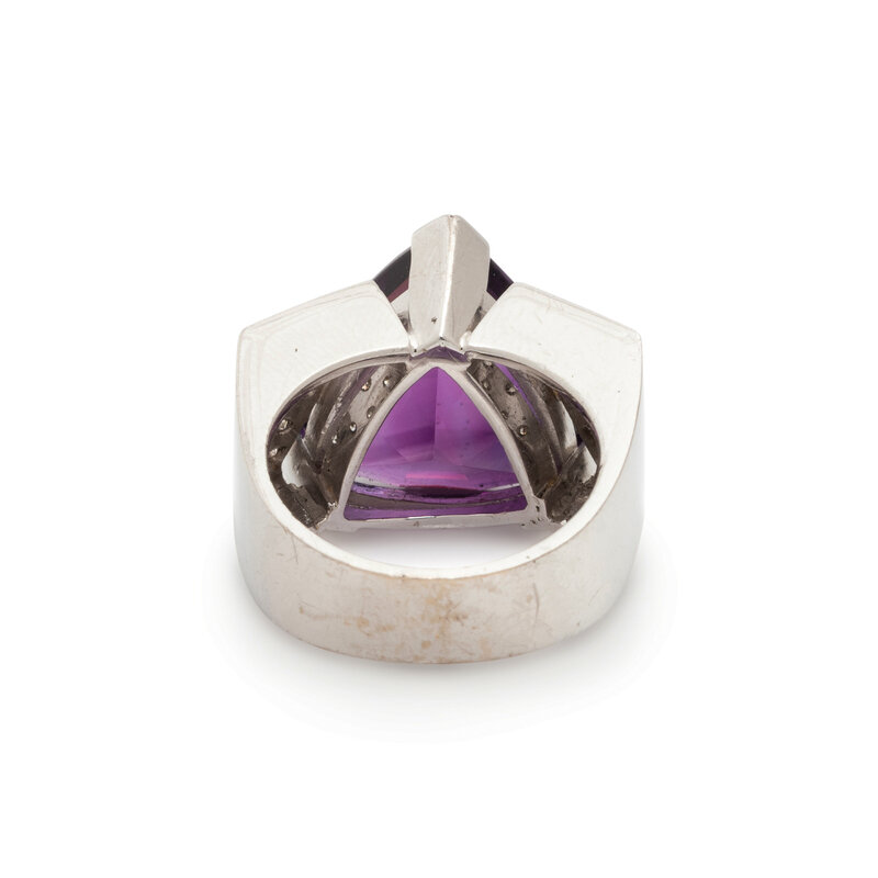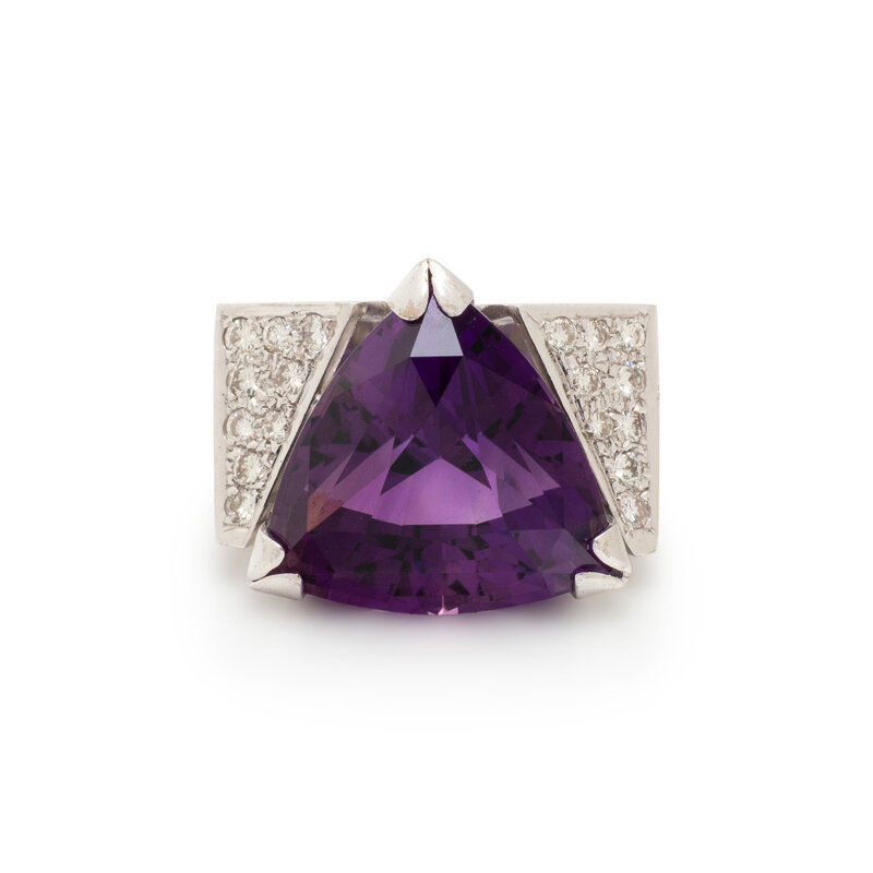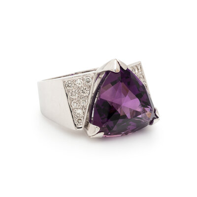 Triangular amethyst measuring approximately 15.50 x 15.50 x 11.85 mm and round diamonds weighing approximately 0.40 carat total. 18 karat white gold. Ring size 6.