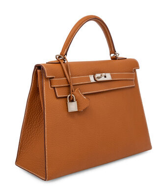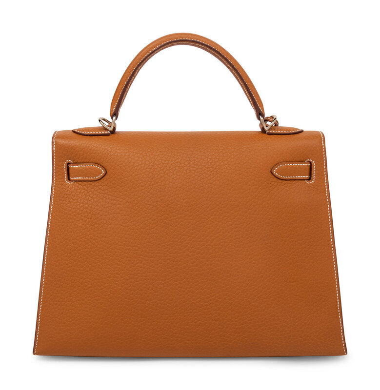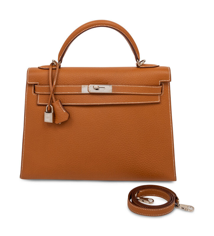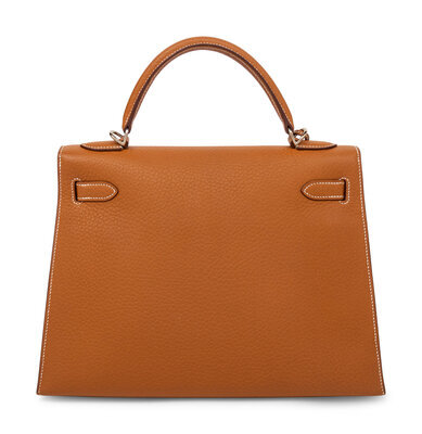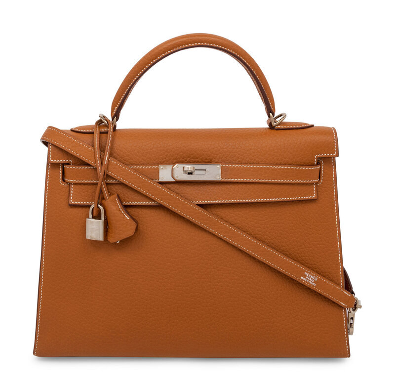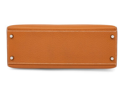 Hermès Kelly 32 Sellier in gold Clemence leather with gold-plated hardware. Includes removable shoulder strap.
