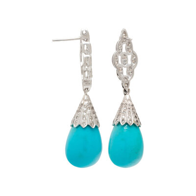 Turquoise drops measuring approximately 12.50 mm wide, and round diamonds weighing approximately 1.70 carats total. White gold. 1 7/8 inches long.