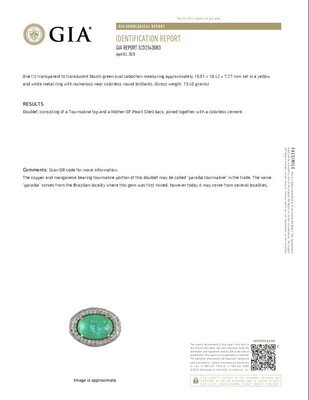 GIA, 2025, Report No. 5232543083, Doublet, consisting of a Tourmaline top and a Mother-of-Pearl Shell back, joined together with colorless cement