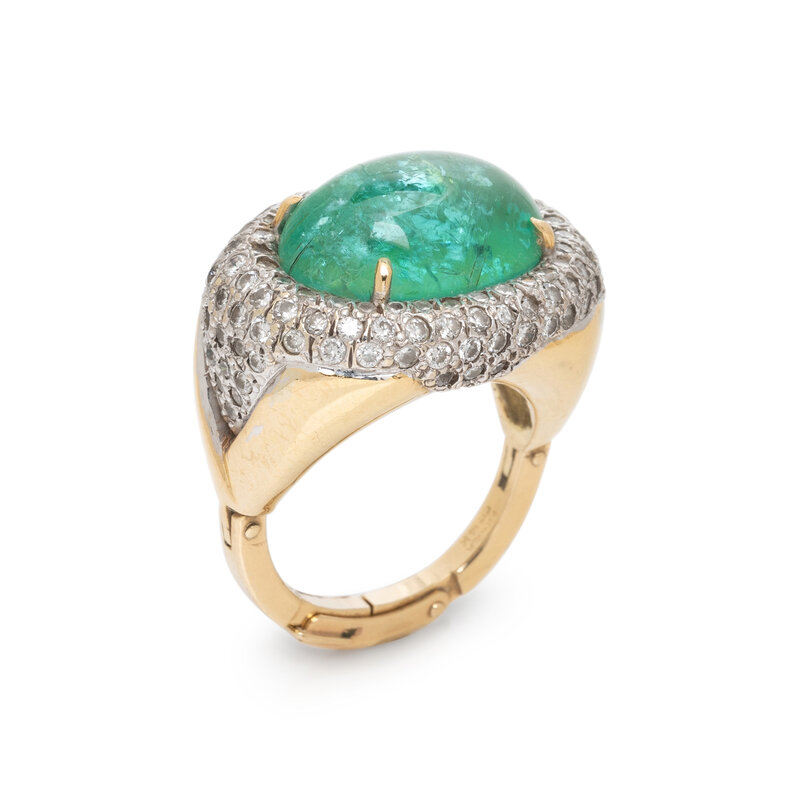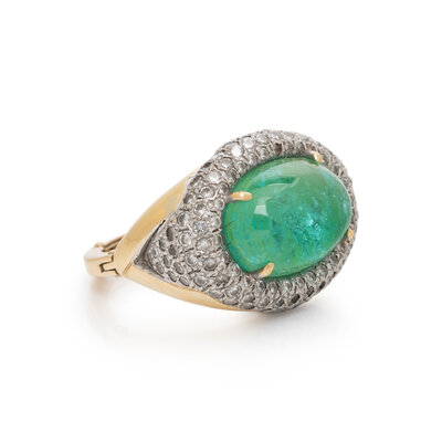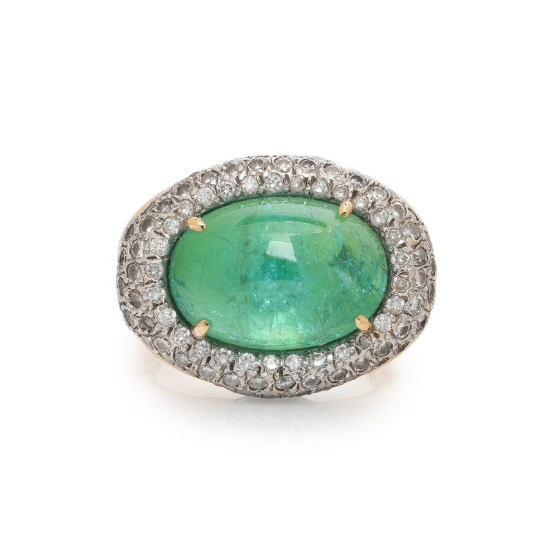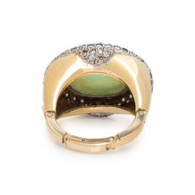 Oval cabochon tourmaline weighing 8.65 carats with mother-of-pearl backing measuring approximately 15.01 x 10.42 x 7.27 mm, and round diamonds weighing approximately 1.50 carats total. 14 karat yellow and white gold. Ring size 5.