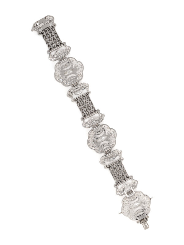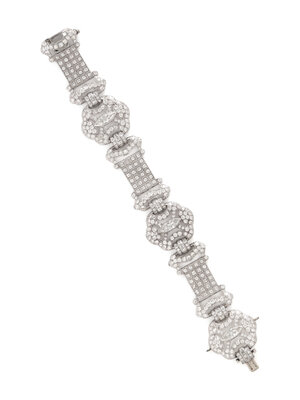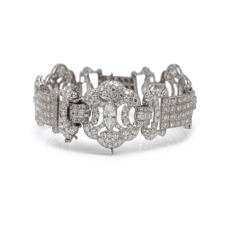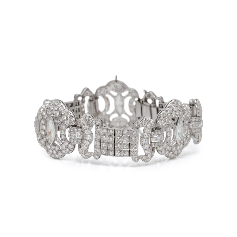 Transitional, single, marquise, and square step cut diamonds weighing approximately 13.50 carats total. Platinum. 7 inches long, 1 inch wide.