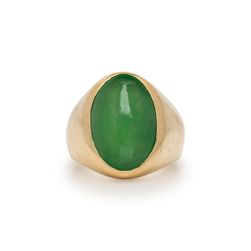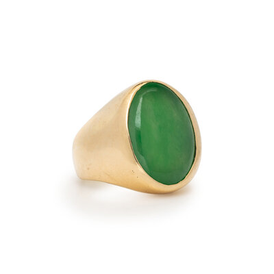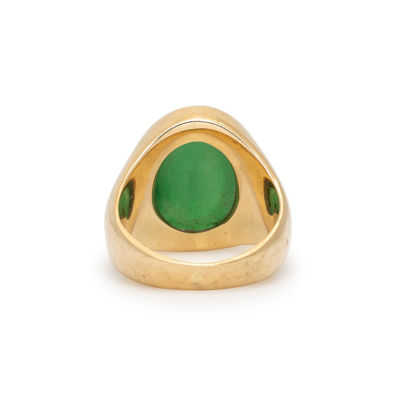 Oval cabochon jade measuring approximately 16.50 x 11.00 x 5.35 mm. 14 karat yellow gold. Ring size 5 3/4.