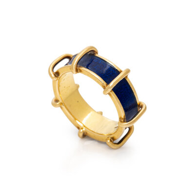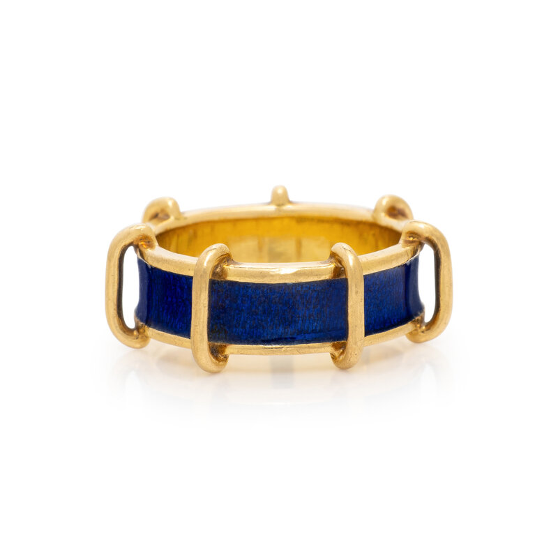 Blue paillonné enamel. 18 karat yellow gold. Ring size 5 3/4.
