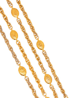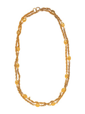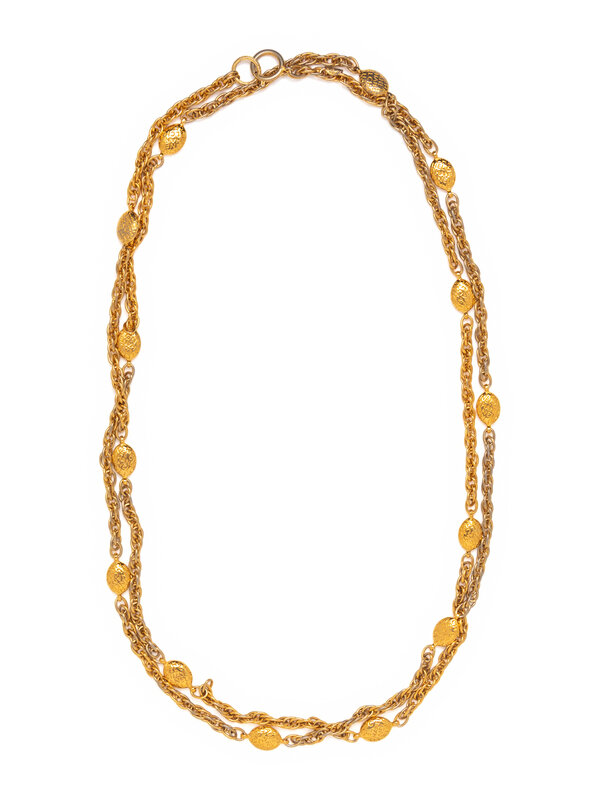 Sautoir in gold-tone metal chain with logo-stamped beads. Circular clasp closure. Stamped 'CHANEL / MADE IN FRANCE'.