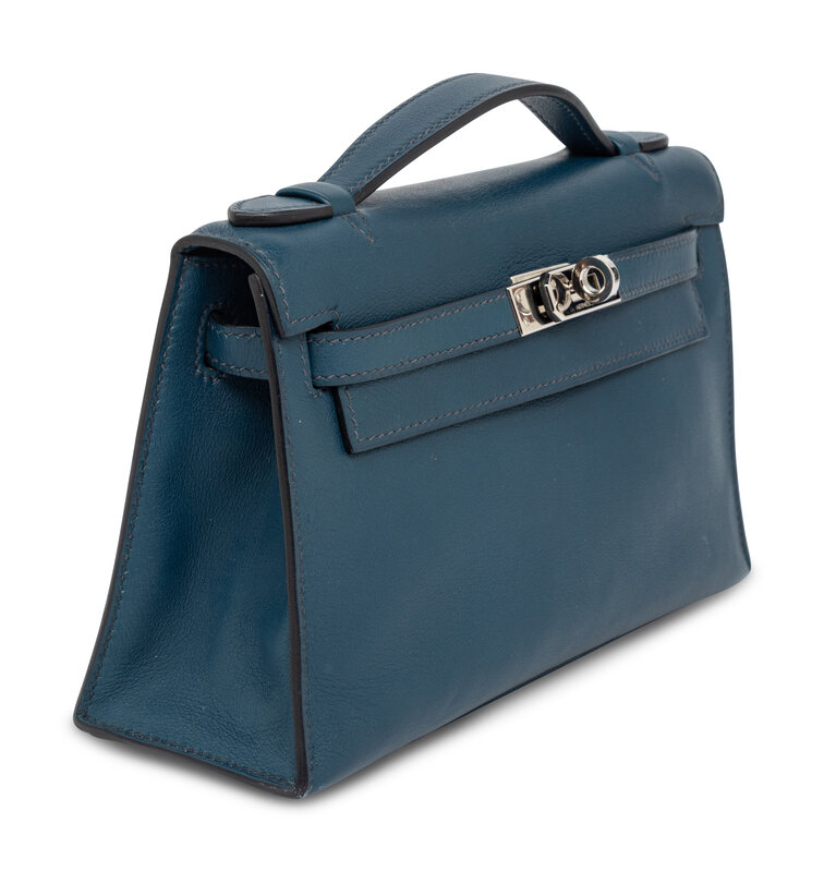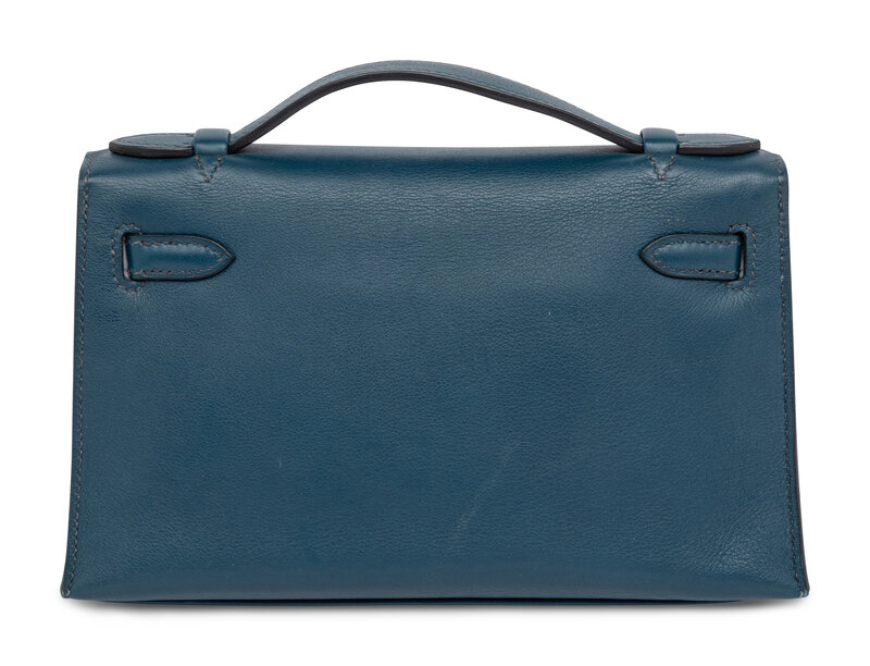 Hermès Kelly Pochette bag in Deep Bleu Swift leather with palladium hardware.
