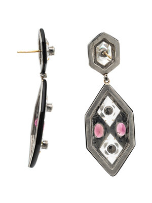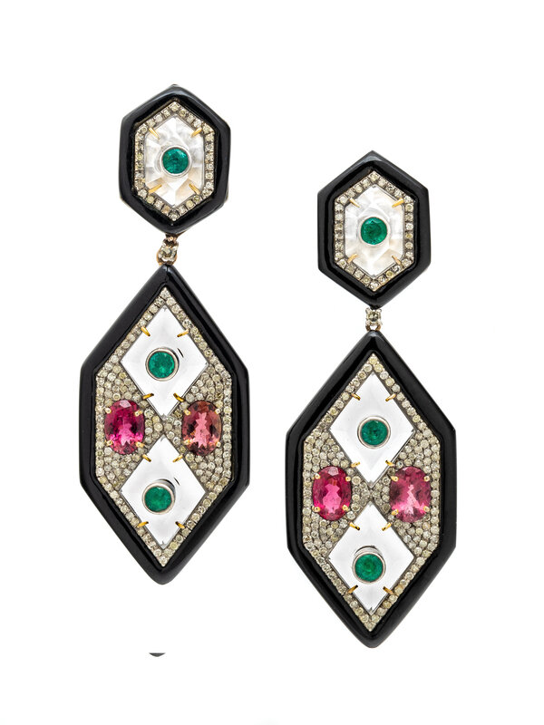 PINK TOURMALINE, EMERALD, DIAMOND, ROCK CRYSTAL, AND BLACK ONYX EARRINGS
