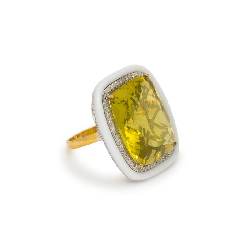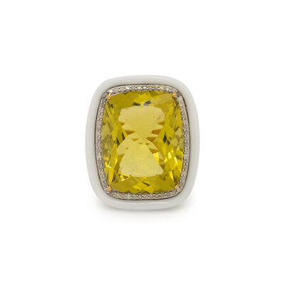 LIME QUARTZ, DIAMOND, AND HARDSTONE RING