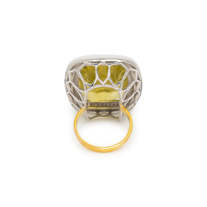 Cushion cut lime quartz weighing approximately 30.00 carats by formula, white chalcedony, and single cut diamonds. Yellow gold and silver. Ring size 7.