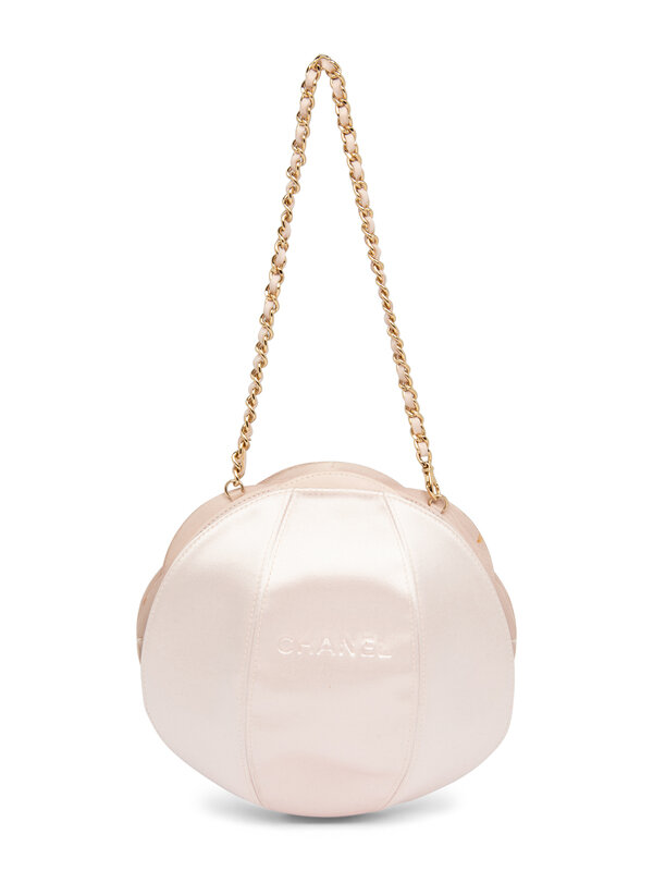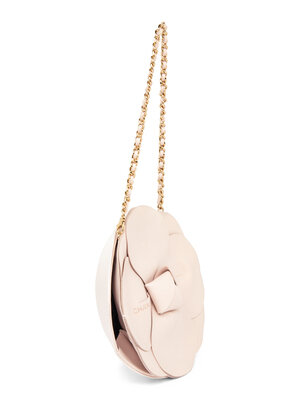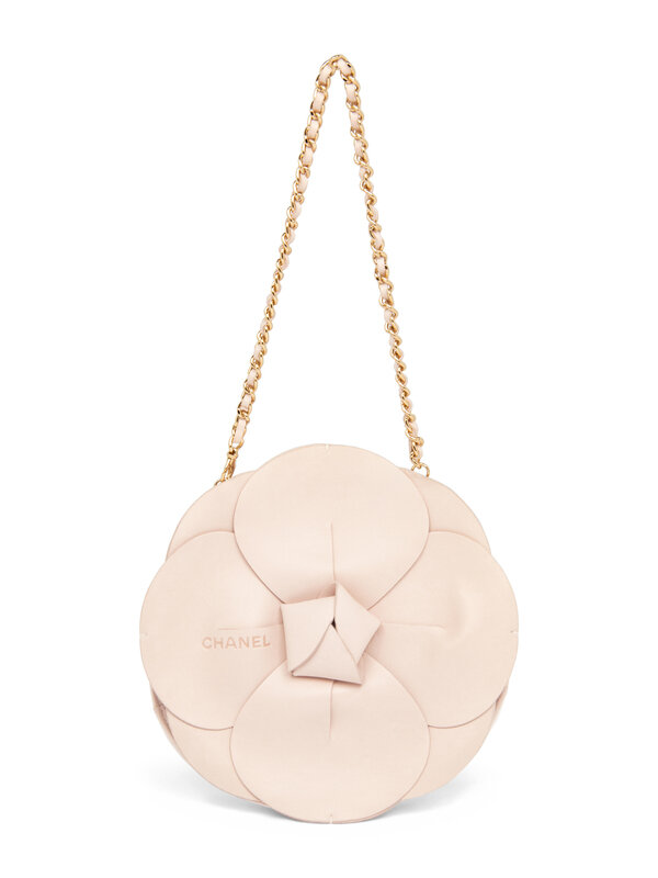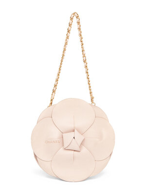 Camellia evening bag in pale pink leather and satin with gold-tone hardware. Magnetic snap closure and interwoven leather-metal chain strap. Stamped 'CHANEL' at front and back.
