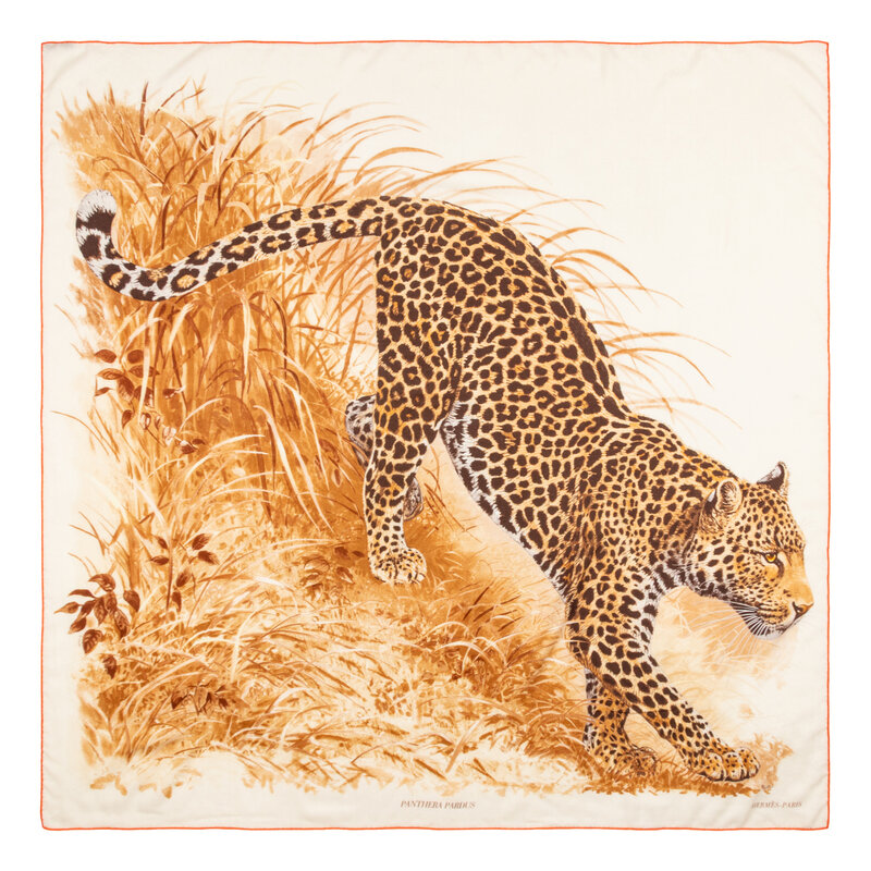 "Panthera Pardus" Scarf 140/Shawl in printed cashmere/silk-blend twill. Features rolled and hand-stitched contrasting edges. Includes box.