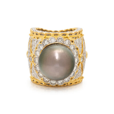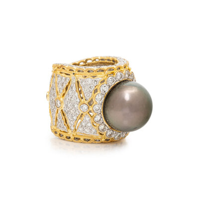 Gray cultured pearl measuring approximately 15.20 mm (origin of color not tested) and round diamonds weighing approximately 4.50 carats total. 18 karat yellow and white gold. Ring size 6 1/2.