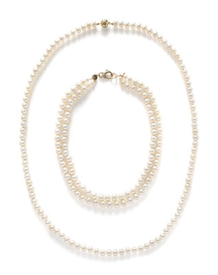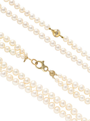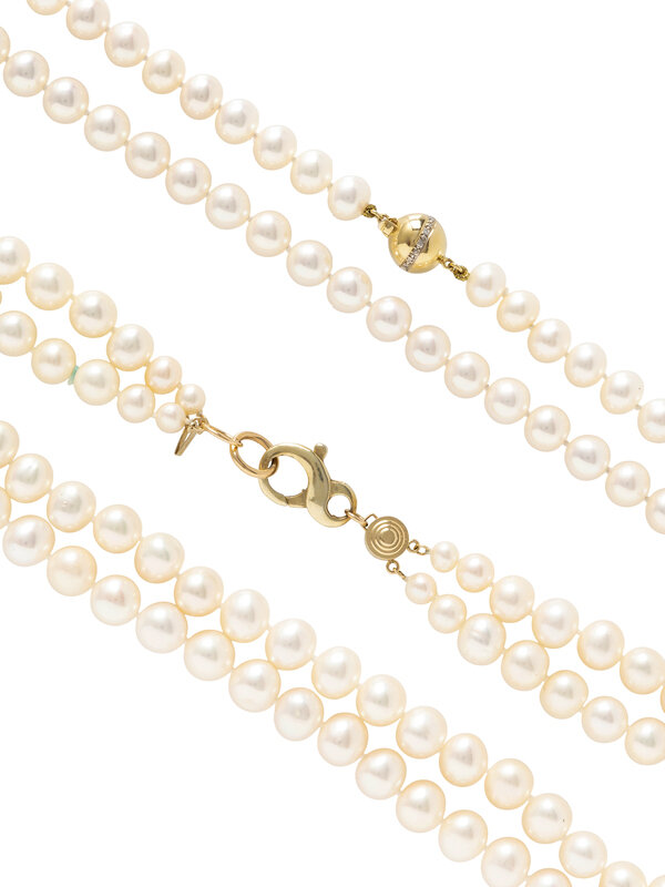 Including one double strand necklace with cultured pearls measuring approximately 5.60 - 10.00 mm with a 14 karat yellow gold clasp, and one single strand necklace with cultured pearls measuring approximately 8.40 - 8.70 mm with a 14 karat yellow gold and round diamond clasp. 19 1/4 inches long and 35 1/2 inches long.