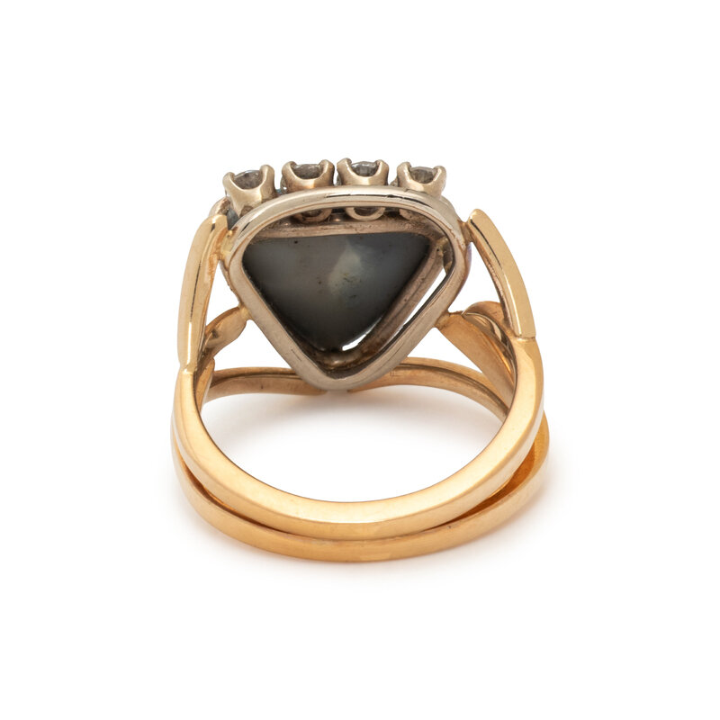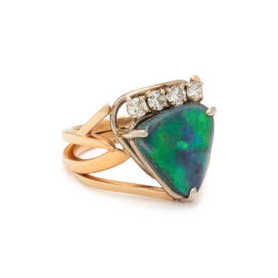 Triangular cabochon opal measuring approximately 11.90 x 11.30 mm and round diamonds. Yellow and white gold. Ring size 5.