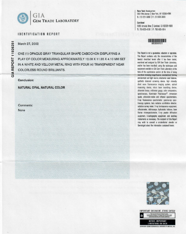 GIA, 2002, Report No. 11926251, Opaque, Gray, Natural Opal, Natural Color