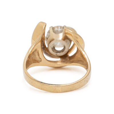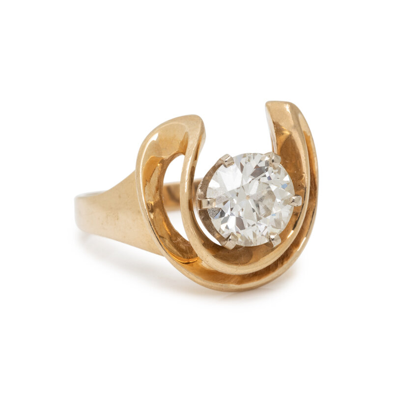 Old European cut diamond weighing 1.68 carats in a swirling half-moon design. 14 karat yellow gold. Ring size 8.